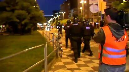 Los Mossos formaron una línea cortando el acceso a Plaza España. Frente a ellos, un joven sentado en el suelo levantaba un cartel tan arrugado que no se podía leer lo que decía. Detrás de él, ardía un contenedor y, sobre ambos, volaban las piedras. Un vecino intentaba apagar las llamas desde su balcón con una manguera. Ante el anuncio de "intervención policial inminente", las vías de los alrededores de la plaza de Sants y las callejuelas de la España Industrial volvieron a convertirse en un correcalles donde unos —la policía antidisturbios— intentaban anticiparse a los otros —los manifestantes—. Los Mossos d'Esquadra detuvieron a 23 personas.
