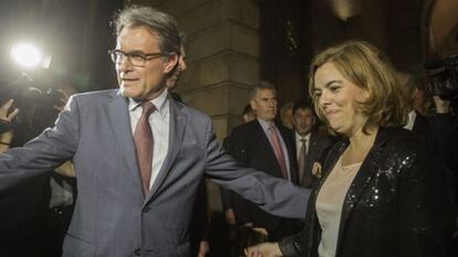 La vicepresidenta del Gobierno, Soraya Sáenz de Santamaría, compartió mesa y atril ayer por la noche en Barcelona con el presidente de la Generalitat, Artur Mas, durante una cena con empresarios en los que ambos defendieron sus puntos de vista con relación al proceso soberanista catalán. Sáenz de Santamaría defendió la unidad de España y subrayó que “está en nuestras manos esforzarnos para defender lo que nos une y limar lo que nos separa”, a lo que Mas respondió defendiendo el proceso soberanista abierto en Cataluña.