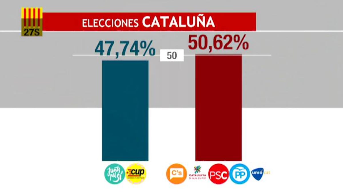 El independentismo catalán vio cumplido este domingo su objetivo de ganar claramente las elecciones en Cataluña al lograr Junts pel Sí y la CUP la mayoría absoluta del Parlamento autónomo. Pero los dos partidos no lograron rebasar el 50% de los votos, lo que puede dar alas al Gobierno para frenar el plan secesionista que ha liderado el presidente catalán, Artur Mas. Ciudadanos, segunda fuerza, destronó al PSC y al PP como principales formaciones no independentistas en Cataluña.