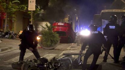 Los manifestantes tumbaron contenedores de basura, se parapetaron tras ellos y lanzaron piedras contra los agentes de la Policía autonómica. Incendiaron la caja de una furgoneta de la empresa municipal BCNeta, volcaron un vehículo y arrojaron al suelo las motocicletas que estaban aparcadas en batería ante la oficina bancaria. A las 22.15 los Mossos d’Esquadra lanzaron salvas con sus escopetas y forzaron la dispersión de los manifestantes, a quienes siguieron por la calle Verdi. Ante la actuación policial algunos vecinos salieron a los balcones de sus casas e improvisaron una cacerolada en protesta por la actuación de la Policía.