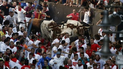 Con los primeros rayos de sol como invitados, los toros enfilaron el primer tramo del encierro con la velocidad propia de la sorpresa inicial, provocada por la marabunta de mozos, imagen extraña para los animales que han vivido cuatro años en la paz de la dehesa.