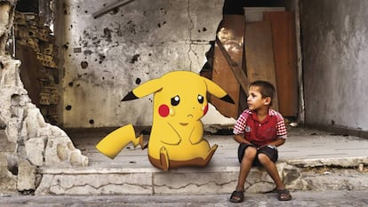 "Cuando veo cómo vive aquí la gente, cuando me cruzo con las familias en su existencia cotidiana, pienso en que mi vida era así antes de la guerra, de las matanzas... Era normal, como la suya. Nadie quería irse, pero la guerra nos ha obligado a exiliarnos. Hace tres o cuatro días hablé con un amigo que sigue en Alepo y me mandó un vídeo de nuestra antigua calle. La destrucción es imposible de describir, cada casa, cada recuerdo, está arrasado. He tratado de reflejar esas experiencias en mis fotos, explicar al mundo lo que nos está ocurriendo a los sirios. Los niños son bombardeados, no van al colegio, no tienen comida, no tienen agua, ni electricidad, ni juguetes... Aquí he visto a mucha gente jugar con los Pokémon en la calle y así se me ocurrió la idea", prosigue Jano, que mezcla sus propios diseños con fotos de la guerra libres de derechos que encuentra en Internet.