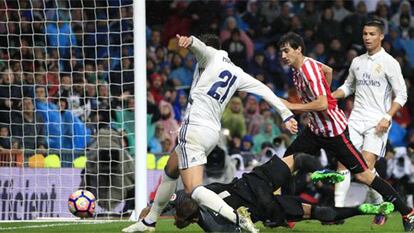 En algunos tramos iniciales fue pasmosa la facilidad con la que a los visitantes se les abrían los pasillos hasta el balcón del área de Keylor, al que Williams probó poco antes del tanto de Benzema. Marcelo ejecutó un formidable y lejano pase en diagonal para Isco. El joven Saborit ganó la posición al malagueño, pero él solo la perdió y acabó de culo. Isco solo tuvo que citar a Benzema con el gol. La diana espabiló a los de Zidane, que sellaron sus mejores momentos del primer acto. El Athletic retrasó la presión, Kroos cogió la bandera y el Madrid gobernó un trecho sin mayor oposición. Marcelo, Isco y Benzema, que dio aire a CR como ariete, se asociaron por la izquierda y abrieron la mejor vía de evacuación del Madrid. Resistió el Athletic y poco a poco los blancos perdieron hueso. Lo adivinó el equipo vasco, que sin delantero puro hizo prevalecer a su columna de centrocampistas. Ausente Aduriz, Valverde apostó por futbolistas para llegar, no para estar: Williams, Raúl García, Eraso, Sabin Merino...