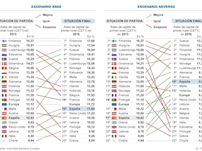 La situación de España es peor en el escenario base, el más previsible. En ese supuesto, la banca española es la 15ª por solvencia de los 22 países europeos analizados y la 10ª de la zona euro, lejos de las primeras plazas.