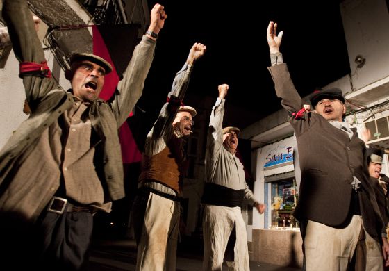 Last Friday, Benalup was converted into the Casa Viejas of eight decades earlier, with CNT banners, roofs of heather and streets of sand. Many residents helped to bring about the conversion, which allowed actors to recreate the events of 80 years against a backdrop of the old Civil Guard building, the headquarters of the CNT, the doomed cottage owned by Francisco Cruz Gutiérrez - also known as "Six Fingers," and the cemetery on the outskirts of town. The actors, including many women representing the families of Casas Viejas, filled the air with screams and cries while a computer-generated projection filled the street where Six Fingers' cottage stood with flames. A requiem composed for the work and flamenco artists accompanied the show.