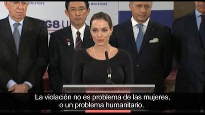 La actriz estadounidense Angelina Jolie se ha sumado en Londres a los actos que se celebran alrededor de la cumbre de ministros de Asuntos Exteriores del G-8 con el objetivo de concienciar sobre la violencia sexual en los conflictos militares. Sus miembros han llegado a un "acuerdo histórico" para combatir la violencia sexual en las zonas de guerra, según anunció el ministro británico de Asuntos Exteriores, William Hague.