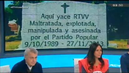En realidad el cierre debió producirse anoche, según los planes de la Generalitat. Así pasó con algunos canales de radio y con el centro territorial de Alicante. Sin embargo, los trabajadores impidieron ese momento, mientras diputados de la oposición llegaban a las instalaciones de RTVV en Burjassot (Valencia) para conjurarse contra la decisión del Gobierno de Alberto Fabra. Este vídeo resume algunos momentos de esa larga noche de programación ininterrumpida, en la que unos presentadores sucedían a otros con la determinación de contar en directo el cierre de la cadena.
