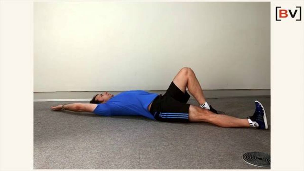 Túmbese boca arriba, coloque un brazo a lo largo del tronco (junto a él) y flexione la pierna del mismo lado. Extienda el otro brazo por encima de la cabeza y alárguelo, junto con la pierna de ese mismo lado, tanto como pueda. Mantenga la posición durante cinco segundos. Desde ahí, arquee ligeramente el cuerpo lateralmente hacia al lado contrario de las extremidades que esté estirando. Mantenga cinco segundos. Cambie de lado, y repita todo cinco veces.
