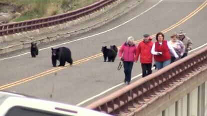Un ejemplar de oso negro con sus cachorros dio un buen susto, que pudo desembocar en tragedia, a unos visitantes del parque nacional estadounidense de Yellowstone el pasado miércoles. Los curiosos estaban observando a los pequeños osos sin guardar la distancia de seguridad, cuando el adulto salió a la carrera para proteger a las crías, de unos 13 meses de edad.