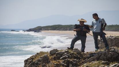 Emilia García Cabrera llora la muerte de su hijo sentada en una silla de plástico bajo la sombra de una gran enramada. Una cruz hecha con velas ocupa el centro del gran rectángulo de concreto. Una audiencia poco común es testigo de sus lágrimas. Medio centenar de hombres armados, vestidos con camisas negras que dicen Policía Comunitaria, la observa con cara de circunstancia. Están sentados con los rifles sobre las piernas. Junto a los sollozos se oye el murmullo del océano Pacífico, que moja la paradisiaca playa de Ixtapilla, en el municipio de Aquila, Michoacán.