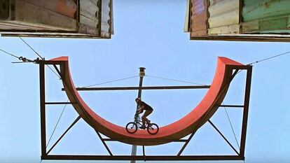 Se llama Drew Bezanson, es canadiense, tiene 26 años y no le importa confesar que durante unas noches tuvo pesadillas. Todo para conseguir un vídeo viral y una buena descarga de adrenalina. Su reto era superar algunos de los mayores obstáculos que haya sorteado nunca un piloto de BMX, una modalidad de ciclismo acrobático. Y es que esos obstáculos eran nada menos que contenedores de casi tres metros de altura. Si además se apilan cuatro, la torre es de 11,7 metros de altura. Y si entre dos de esas torres se suspende una pared curva que pone al ciclista en paralelo al suelo al cruzarla, el resultado son las pesadillas del protagonista. Objetivo cumplido porque, según las palabras de Bezanson en la web de su patrocinador, la idea era montar obstáculos que le diesen miedo para sentirse como cuando era un niño y comenzó a hacer piruetas con la bici.