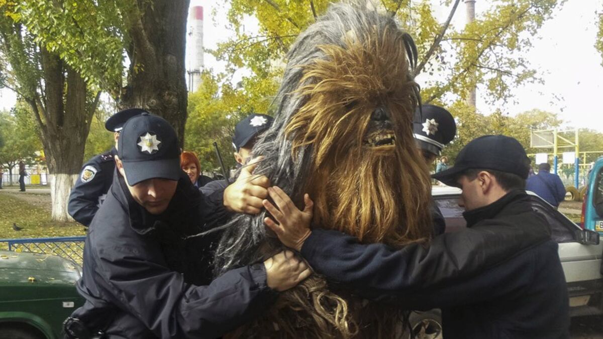 Chewbacca ha sido detenido este domingo en Ucrania cuando hacía campaña a favor del Partido de Internet por negarse a identificarse con su nombre real y a entregar su carné de conducir. La imagen se ha convertido en una de las anécdotas de las elecciones locales ucranianas celebradas ayer. Como se puede ver en este vídeo, hasta cuatro agentes son necesarios para reducir al individuo, que ha quedado en libertad sin cargos tras pagar una multa por el incidente.