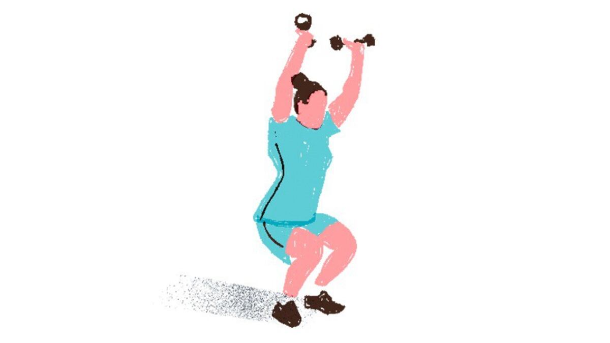 Con un peso adecuado, extienda los brazos sobre la cabeza. Los talones van paralelos a las caderas y las puntas hacia afuera. Haga el gesto de sentarse con la espalda recta hasta que las caderas lleguen a la altura de las rodillas.