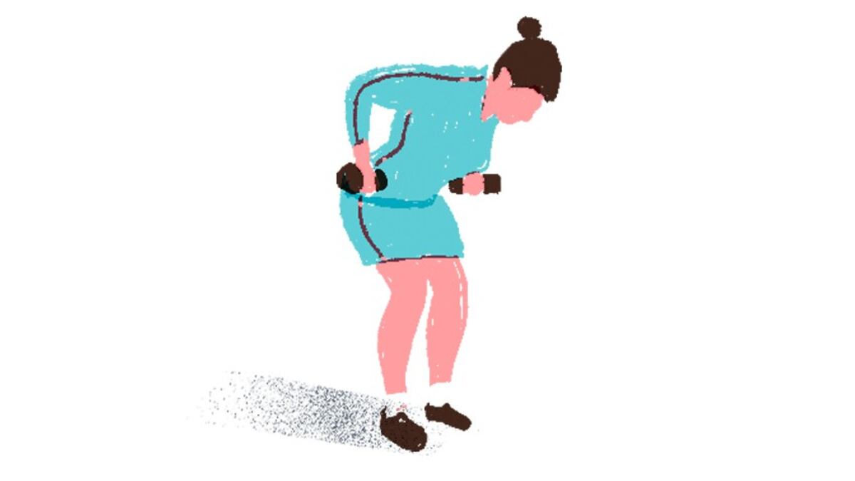 Flexione las rodillas e inclínese con el tronco recto. Con las mancuernas al frente reme elevando los codos hacia el techo. Lo más importante es el movimiento de los codos llevando el peso a la parte más baja de la cintura.