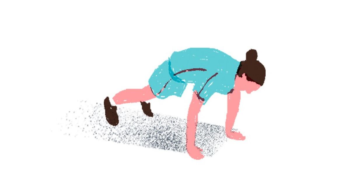 Flexione las rodillas para apoyar las palmas de las manos en el suelo, y desde ahí extienda las piernas hacia atrás para apoyar las puntas de los pies. Regrese a posición de cuclillas y póngase de nuevo en pie.