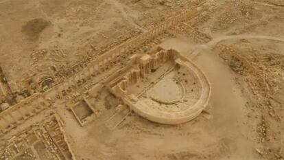 Un dron del canal ruso Rossiya 24 ha captado el estado de las ruinas de la ciudad siria de Palmira, tras el paso de las fuerzas del ISIS. Pese a los graves daños causados por el Estado Islámico, que asumió el control de la ciudad en mayo del año pasado, las primeras imágenes demuestran que algunas partes importantes de la ciudad antigua siguen en pie, como el anfiteatro o la plataforma de columnas conocida como el tetrapilón.