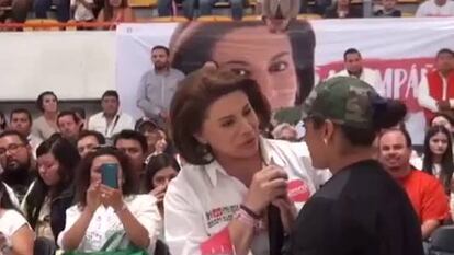 "Muy buenas tardes mi nombre es y yo no pienso votar por el Doctor Ríos, el me prometió hace un año una tomografía y hasta ahorita todavía la estoy esperando”, dice la mujer frente a la audiencia. Lorena Martínez, la candidata del PRI al gobierno de Aguascalientes, intenta tapar el micrófono con sus manos.