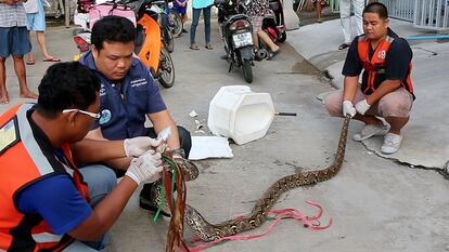 Un vecino de Chachoengsao, a unos 90 kilómetros de Bangkok (Tailandia), se topó con un gran susto en el baño de su casa. Cuando Attaporn Boonmakchuay, de 38 años, estaba sentado en el inodoro, una serpiente pitón de tres meses le atacó inesperadamente. El hombre forcejeó con el reptil hasta que logró zafarse de él con la ayuda de su esposa y un vecino, poco antes de desmayarse. Boonmakchuay ha atendido a los medios locales en el hospital, donde los médicos han afirmado que se recuperará satisfactoriamente de las heridas.