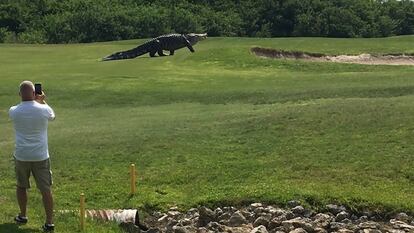 Cuando los jugadores de un campo de golf de Florida, en EE UU, vieron a unos metros de su hoyo a un enorme caimán de cinco metros, pensaron que era broma televisiva. Aquel animal parecía sacado de Parque Jurásico. El tamaño descomunal les asustó, aunque se encontraban a una prudencia considerable como para poder grabar al reptil con sus teléfonos móviles, mientras este se desplazaba tranquilamente hasta el estanque del campo. El vídeo fue filmado por el jugador Charles Helms, que decidió publicarlo en su cuenta de Facebook. Aunque no es tan sorprendente ver a cocodrilos por campos como este, a quien no les sorprendió en absoluto esta presencia fue a los responsables del campo de golf de Buffalo Creek, en la localidad de Palmetto. El animal, según ha recogido theguardian.com, es una suerte de mascota del campo y nunca ha molestado a los jugadores en su juego.