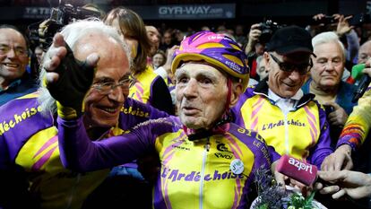 La proeza ha tenido lugar en el velódromo nacional de Saint-Quentin-en-Yvelines, al suroeste de París. Robert Marchand estableció hoy el récord mundial de la hora en bicicleta al recorrer 22,547 kilómetros dentro de la categoría de corredores que, como él, tienen 105 años o más. "Estoy bien", ha asegurado al bajarse de la bicicleta visiblemente emocionado por el numeroso público que ha acudido para acompañarle. El deportista más viejo del mundo, como él se define, revela que el único secreto para tener una salud de hierro con su edad es hacer mucho deporte, comer frutas y verduras, no fumar y tomar poco café y alcohol. Los 22,547 kilómetros los ha recorrido en 92 vueltas al circuito, pero los medios franceses le han recordado que deberá someterse a un control antidopaje para que su récord sea homologado por la la Unión Ciclista Internacional. Marchand ha asegurado que lo único que toma antes de la carrera es su poción mágica, un poco de miel en su botellín de agua.