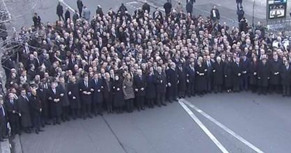 LÍDERES INTERNACIONALES EN LA CABECERA. De izquierda a derecha, el presidente de la Comisión, Jean-Claude Juncker; el primer ministro israelí, Benjamin Netanyahu; el presidente de Malí, Ibrahim Boubacar Keita; el presidente francés, Francois Hollande; la canciller alemana, Angela Merkel; el presidente del Consejo, Donald Tusk, y el presidente palestino, Mahmoud Abbas. / FOTO: Olivier Hoslet (Efe)