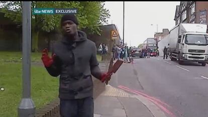 Con las manos ensangrentadas y agarrando un machete y un cuchillo, uno de los presuntos atacantes que ha matado a un soldado esta tarde en plena calle en Londres se dirige a una cámara: "Sentimos que las mujeres hayan tenido que ver esto, pero en nuestra tierra esto es lo que ven nuestras mujeres. Nunca estaréis seguros. Deshaceos de vuestro Gobierno. No se preocupan por vosotros", asegura el sospechoso, en unas imágenes recogidas por un transeúnte que ha difundido la cadena Itvnews.