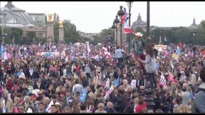 Decenas de miles de personas convocadas por la asociación Manif pour Tous, lanzada desde las parroquias católicas de Francia, han desfilado hoy por tercera vez en París contra la ley Taubira, promulgada hace dos semanas por el presidente François Hollande y que extiende a las parejas homosexuales el derecho a casarse y adoptar hijos. En una capital blindada por 4.500 policías, con decenas de calles cortadas y una docena de paradas de metro cerradas por precaución, la marea rosa y azul ha reunido a unas 150.000 personas, según la policía, más de un millón según los convocantes.