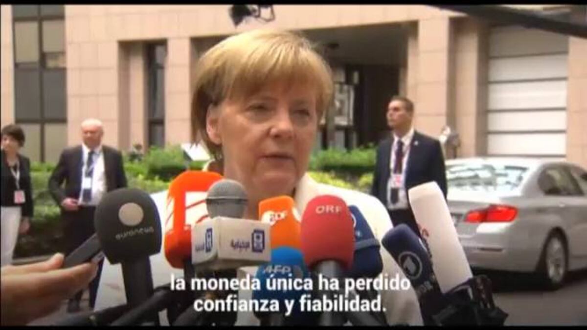Alemania envía señales de que el pacto necesario para un tercer rescate griego resulta muy complejo. "La moneda más importante que hemos perdido es la confianza", ha asegurado la canciller alemana, Angela Merkel,a su llegada a la cumbre de países del euro que se celebra esta tarde en Bruselas. La dirigente germana aludía así a los temores expresados por políticos y expertos sobre el golpe mortal al euro que puede provocar una salida de Grecia de la moneda común. "No habrá un acuerdo a cualquier precio. Hoy mantendremos conversaciones duras", ha augurado Merkel. El primer ministro griego, Alexis Tsipras, se ha reunido esta tarde con Merkel, con el presidente francés, François Hollande, y con el presidente del Consejo Europeo, Donald Tusk, en el marco de la cumbre, ha informado un funcionario del Gobierno griego.