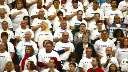Si el republicano Donald Trump actúa a las siete de la tarde hay que ir a las seis. O antes. La cola que serpentea este lunes por la noche por un casino de Las Vegas (Nevada) parece que ocupa entero un largo pasillo de unos 30 metros. Pero es un efecto óptico. Al final del pasillo se dobla, entra en un enorme espacio de convenciones, da toda la vuelta al recinto pegada a la pared, vuelve a salir por la misma puerta, recorre de nuevo el mismo pasillo hacia atrás y entra por otra puerta hacia otro enorme espacio de convenciones. Entonces se organiza en filas paralelas, como el control de un aeropuerto, por las que miles de personas caminan lentamente hacia los arcos de seguridad.