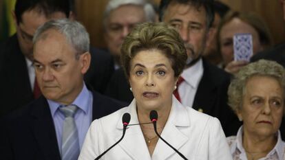 "Mi Gobierno ha sido objeto de un intenso sabotaje", recalcó la mandataria en la sede del Gobierno en Brasilia, ante la prensa y rodeada de ministros y simpatizantes. Se presentó como la víctima de un golpe de Estado contra su Gobierno, como ha repetido durante las últimas semanas. "Lo que está en juego no es mi mandato, es el respeto a las urnas, a la voluntad de los brasileños y a las conquistas de los últimos 13 años", subrayó.