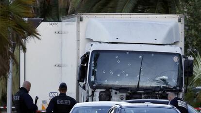 La policía disparó contra el conductor del camión y, en seguida, se sumaron más agentes que en total descargaron una cincuentena de balas sobre la cabina hasta matar al agresor. Tres policías nacionales de Niza ya habían intervenido antes para detener al atacante. François Molins, el fiscal antiterrorista, ha declarado que Bouhlel disparó contra tres policías antes de ser neutralizado. Los agentes respondieron con disparos y corrieron más de 200 metros detrás del camión blanco frigorífico para tratar de atraparlo. Después, el camión descendió por la acera a la altura del Palacio del Mediterráneo, donde la muchedumbre se agolpaba. Fue en ese lugar donde el camión mató a una treintena de personas, según los testigos.