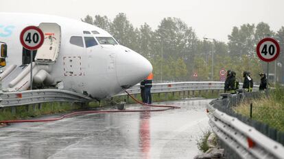 Un avión de carga se salió de la pista la madrugada de este viernes cuando aterrizaba en el aeropuerto de Bérgamo, al norte de Italia, y terminó cruzando una carretera local. No hubo víctimas, aunque el aeropuerto estuvo cerrado varias horas y la compañía Ryanair tuvo que suspender 15 vuelos con destinos como Madrid e Ibiza.