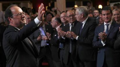 Sus estrategas y colaboradores han pasado dos semanas anunciando la importancia de su conferencia, organizada por dos fundaciones próximas a los socialistas. En la Sala Wagram le esperaba en primera fila medio Gobierno, con su primer ministro, Manuel Valls, al frente y los principales jefes del partido. Puestos en pie, como el millar de altos cargos y cuadros asistentes, el presidente ha sido recibido con más de un minuto de cerrados aplausos.