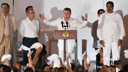 Juan Manuel Santos (Bogotá, 1951) apenas llevaba tres días como presidente cuando recibió en la Quinta de San Pedro Alejandrino, en Santa Marta, en el Caribe colombiano, al entonces mandatario venezolano, Hugo Chávez. Había entablado los primeros contactos secretos con las FARC para iniciar un proceso de paz. Sabía de la necesidad de involucrar a Venezuela. Muchos de los máximos líderes guerrilleros gozaban del amparo del chavismo. El precio a pagar fue muy alto. Le granjeó la enemistad de la persona que le había nombrado sucesor y le aupó a la Casa de Nariño. Álvaro Uribe nunca le ha perdonado la traición de acercarse a su mayor enemigo en América Latina. Aquella reunión en la casa donde murió Simón Bolívar supuso un impulso determinante para la consolidación del arranque de las negociaciones con las FARC. Constató que Santos estaba dispuesto a todo por lograr la paz en Colombia.