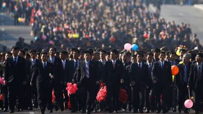 Más de 10.000 personas se agolpaban en el inicio de la calle para recibir a su líder, en un anticipo del baño de masas que Kim Jong-un se dará el sábado, con un espectacular desfile militar y civil. Funcionarios vestidos idénticos en chaqueta Mao y corbata; militares con charreteras y gorra de plato; mujeres de todas las edades ataviadas con coloridos hanbok, el vestido femenino tradicional. Todos a una se lanzaron a aplaudir febrilmente cuando compareció el Líder Supremo.