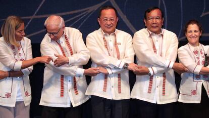 El intercambio de impresiones entre Kang Kyung-wha, ministra de Exteriores de Corea del sur, y su homólogo norcoreano, Ri Yong-ho, duró apenas tres minutos. Tras un formal apretón de manos, según explicó este lunes un alto cargo del Ministerio de Asuntos Exteriores surcoreano a la agencia Yonhap, Kang instó a Ri a responder "lo antes posible" a la oferta de diálogo de Seúl. "Teniendo en cuenta la situación actual, en la que el Sur colabora con Estados Unidos para presionar al Norte, estas propuestas carecen de sinceridad", le espetó Ri.