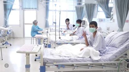 Las autoridades tailandesas han difundido este miércoles las primeras imágenes en el hospital de los 12 niños que estuvieron atrapados con su entrenador en la cueva de Tham Luang, en el norte de Tailandia, desde el 23 de junio. La operación de salvamento concluyó este martes con éxito en una carrera contra el agua y contra el tiempo y pese a abrumadoras dificultades técnicas.