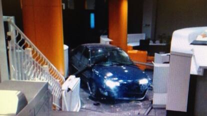 El vehículo ha entrado a gran velocidad y ha llegado hasta las escaleras del interior y casi se lleva por delante a una empleada de la limpieza que estaba trabajando desde primera hora. La cristalera de la puerta principal ha quedado destrozada y un reguero de aceite y carbonilla recorre la calle desde la puerta hasta el comienzo de la acera.