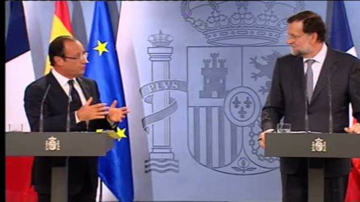 El jefe del Ejecutivo ha buscado hoy el apoyo del presidente francés al exponerle las propuestas españolas para garantizar la estabilidad de la zona euro y reforzar la integración económica y política en la UE. En la comparecencia posterior a la reunión, celebrada en el Palacio de la Moncloa, el mandatario francés ha asegurado que, pese a pertenecer a partidos distintos, comparte la misma visión para la Unión. "Rajoy y yo tenemos la misma visión del futuro para Europa”, ha señalado Hollande. Esto es, una mayor integración fiscal y monetaria de los países miembros y el compromiso de todos con la irreversibilidad del euro.
