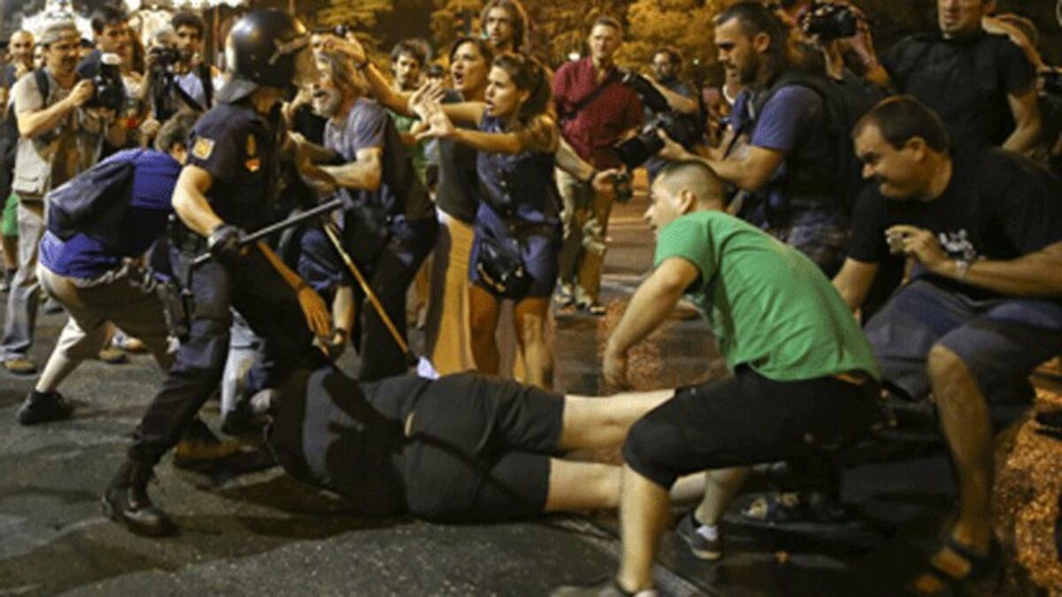 La madrugada en el centro de Madrid acabó con la detención de dos personas y con 12 heridos por los enfrentamientos entre las fuerzas de seguridad y los manifestantes que habían iniciado una protesta contra la corrupción en las inmediaciones de la sede del PP, en la calle de Génova. A primera hora de la mañana los dos manifestantes detenidos han quedado en libertad. Se trata de S. P. M., de 35 años, y V. P. R., de 22, ambos sin antecedentes policiales, que fueron acusados de atentado a agentes, desobediencia y resistencia y desórdenes públicos, informa Efe.