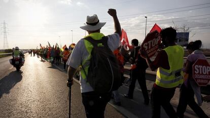 Hasta Ocaña (Toledo) se fue Antonio Márquez, 57 años, para sumarse a la Marcha de la dignidad que llegaba de Andalucía. Vecino de Pinto y miembro de la Plataforma de Desempleados, ha decidido incorporarse a la columna y quedarse en ella hasta al sábado. "Protestamos por un trabajo digno. Y para que aprueben una renta mínima", recalca mientras anda por el arcén de la M-480. Este vendedor de material eléctrico, parado desde hace 15 meses, tiene claro que estas manifestaciones deben servir para cambiar el sistema. "Venimos a remover Madrid, pero en el buen sentido".