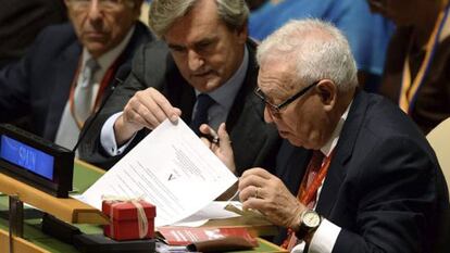 España estará en el Consejo de Seguridad, el principal órgano decisorio de Naciones Unidas, por quinta vez en su historia. Los 193 miembros de la Asamblea General eligieron este jueves a la candidatura española y a Nueva Zelanda para ocupar durante el bienio 2015-2016 los dos asientos vacantes del grupo de Europa Occidental y otros países. Fueron necesarias tres votaciones y su inevitable suspense para que la delegación española, encabezada por el ministro de Exteriores, José Manuel García Margallo, pudiera celebrar su éxito tras nueve años de campaña. "Spain is back (España ha vuelto)", proclamó el jefe de la diplomacia española. Los otros tres puestos rotatorios de miembros no permanentes del Consejo fueron para Angola (190 votos), Malasia (187) y Venezuela (181).