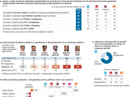 Junto a los datos, las apreciaciones de los ciudadanos rezuman ganas de cambio, lo que va en detrimento del bipartidismo. Un 77% de los encuestados no quieren que el PP y el PSOE sean los partidos que decidan en solitario los destinos del país. Este sentir, si se concreta en las urnas, llevará aparejada otra forma de hacer política, basada en el diálogo y el pacto. El 74% de los consultados quiere que el partido más votado gobierne con apoyos puntuales, ni siquiera permanentes, de otros partidos. No es baladí, sin embargo, que el 68% de los consultados deje plena libertad al partido por el que piensa votar para que, tras las elecciones, decida qué pactos son los más convenientes. “Esto viene a cuestionar frontalmente la extendida idea de que los ciudadanos necesitan saber, con claridad y por anticipado, la posible política de alianzas de los partidos antes de decidir su voto”, sostiene José Juan Toharia, presidente de Metroscopia. El pacto menos deseado sería una gran coalición entre PP y PSOE, que solo obtiene el apoyo del 26%.