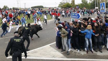 Allí, donde el enfrentamiento entre detractores y defensores del festejo se ha prolongado desde las ocho de la mañana, han vuelto a repetirse los gritos, los insultos. Y los golpes. "Asesinos", han voceado los animalistas. "Piojosos. Fuera de aquí", le ha respondido el bando contrario. Y la tensión ha vuelto a elevarse, aunque el momento más crítico se ha vivido una hora antes, sobre las once, cuando los antitaurinos han tratado de taponar el trazado en dos puntos. En la rotonda, decenas de manifestantes se han agarrado los brazos, apiñados. Y en la entrada al trazado campestre, otro grupo ha hecho lo mismo. Pero los organizadores, pese a que la Guardia Civil ha informado de que los concentrados se hallaban en el recorrido, han abierto las puertas para que Rompesuelas se lanzara a la carrera. "Estábamos atados, bloqueando el camino, cuando lo han soltado", ha denunciado un animalista, que ha visto como el morlaco ha pasado a solo un metro y medio de él.