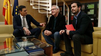 Izquierda Unida ha salido de su primera reunión con Sánchez con una advertencia para todas las formaciones políticas, pero que se leía dirigida especialmente a Podemos. Quien dificulte ese posible Gobierno de Sánchez perderá credibilidad y eso tendrá repercusión en las urnas en caso de repetirse las elecciones. Lo ha señalado hasta en dos ocasiones el coordinador general de la coalición, Cayo Lara, quien se ha reunido esta tarde junto a Alberto Garzón con el líder socialista. "Quien ponga chinas en las ruedas para que no haya un Gobierno de progreso, va a perder credibilidad ante la opinión pública", ha manifestado Lara. "Quien ponga zancadillas se está equivocando y lo debería de pagar", ha abundado. En su opinión, el país tiene la "necesidad vital" de tener ya un Ejecutivo que afronte los problemas.