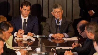 Su intervención también provoca alguna protesta. Al igual que a su llegada a Caracas, Rivera menciona a Podemos y recuerda que el partido de Pablo Iglesias no apoyó en abril una moción en favor de la liberación de los opositores venezolanos. No es la única vez que el nombre de esta formación se escucha entre las paredes de la Asamblea. El diputado Luis Florido pide que la Comisión de Contraloría aclare si el Gobierno venezolano financió en el pasado a Podemos, y Freddy Guevara, su presidente, anuncia que la Cámara invitará a los representantes de este partido para aclarar la cuestión. La formación de Iglesias siempre ha negado cualquier vinculación entre su financiación y Venezuela.