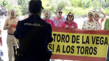 Cerca de un centenar de partidarios del Toro de la Vega se han concentrado ante las Cortes para protestar en contra del decreto-ley con pancartas en las que se podía leer Viva el Toro de la Vega, Sí al Toro de la Vega, Sí a los toros, firmadas por el Foro Taurino Tordesillano.