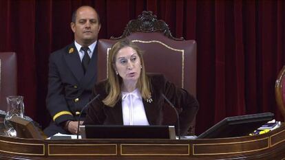La presidenta del Congreso ha aprovechado una pausa del debate para dar una llamada de atención y recordar que "el diccionario de la Lengua dice que tendedero es un dispositivo de cuerdas y alambres donde se tiene ropa". "Este hemiciclo no es un tendedero, es la representación de todos los españoles". "Hay que tener respeto a la institución y a este hemiciclo", ha añadido.