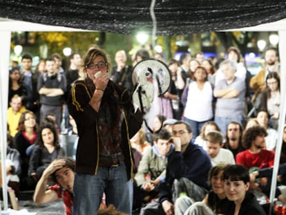 Un centenar de personas participó ayer en una asamblea en plaza de Catalunya, El movimiento inicia hoy la celebración de su aniversario, que durará hasta el martes