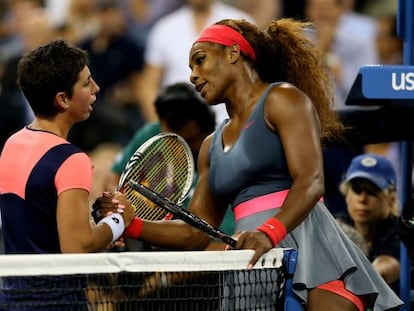 Carla Suárez y Marcel Granollers, debutantes frente a los remolinos de la central, se deshacen en el saque y suman solo tres juegos frente a Serena y Djokovic, los números uno